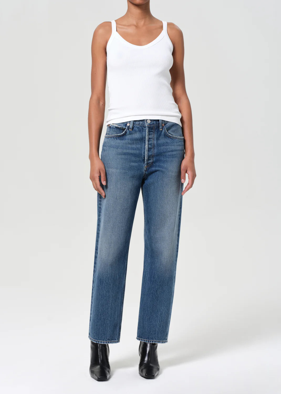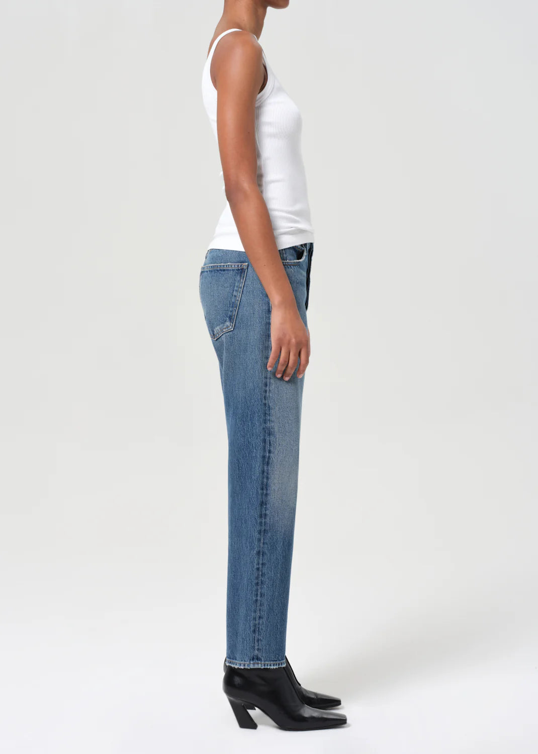 A timeless, relaxed silhouette in medium vintage indigo with subtle fading, marbling, and whiskering details. This mid-rise jean sits comfortably at the waist with a loose fit through the thigh, flowing into a straight leg. Made from rigid, non-stretch 100% regenerative cotton denim.