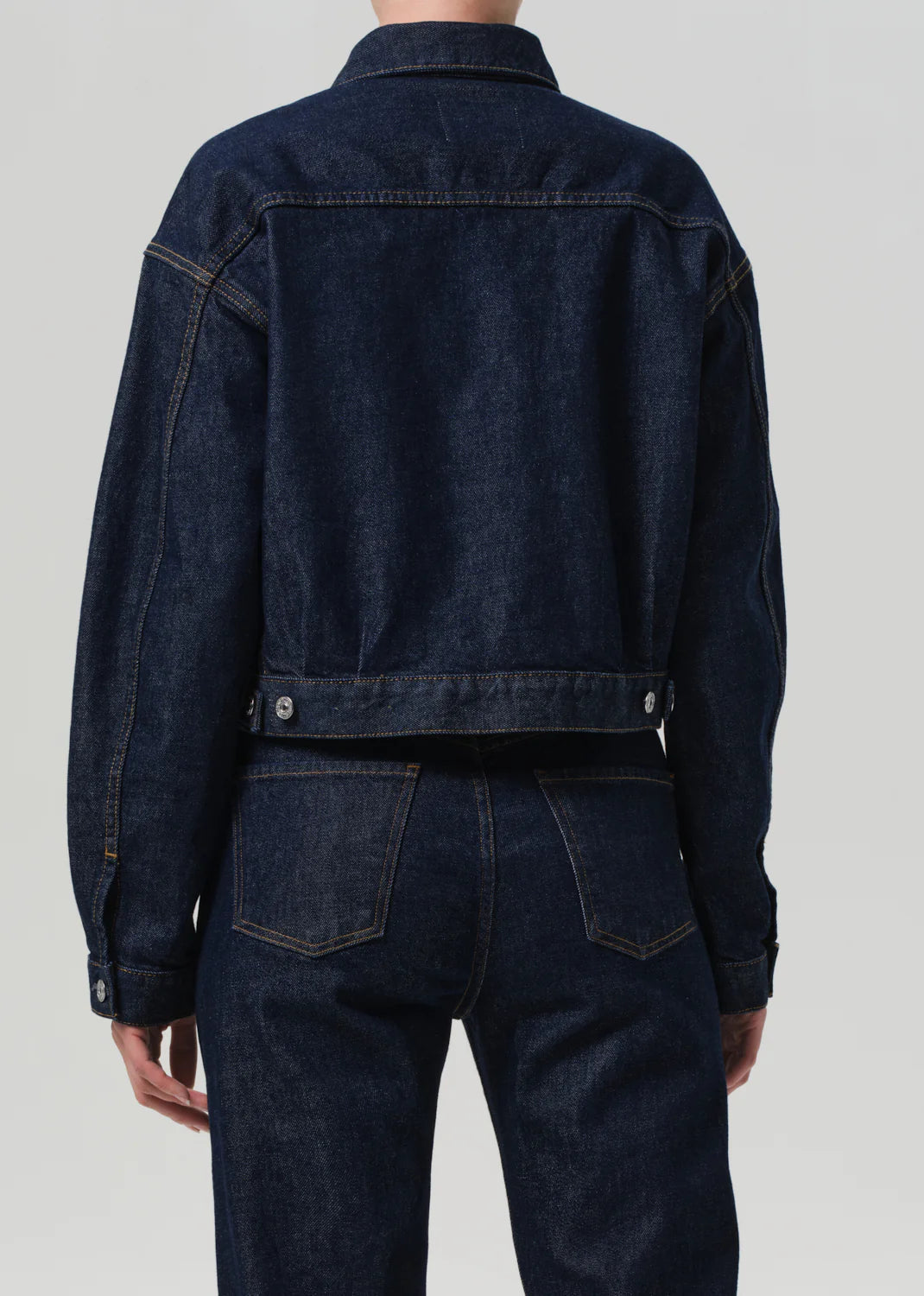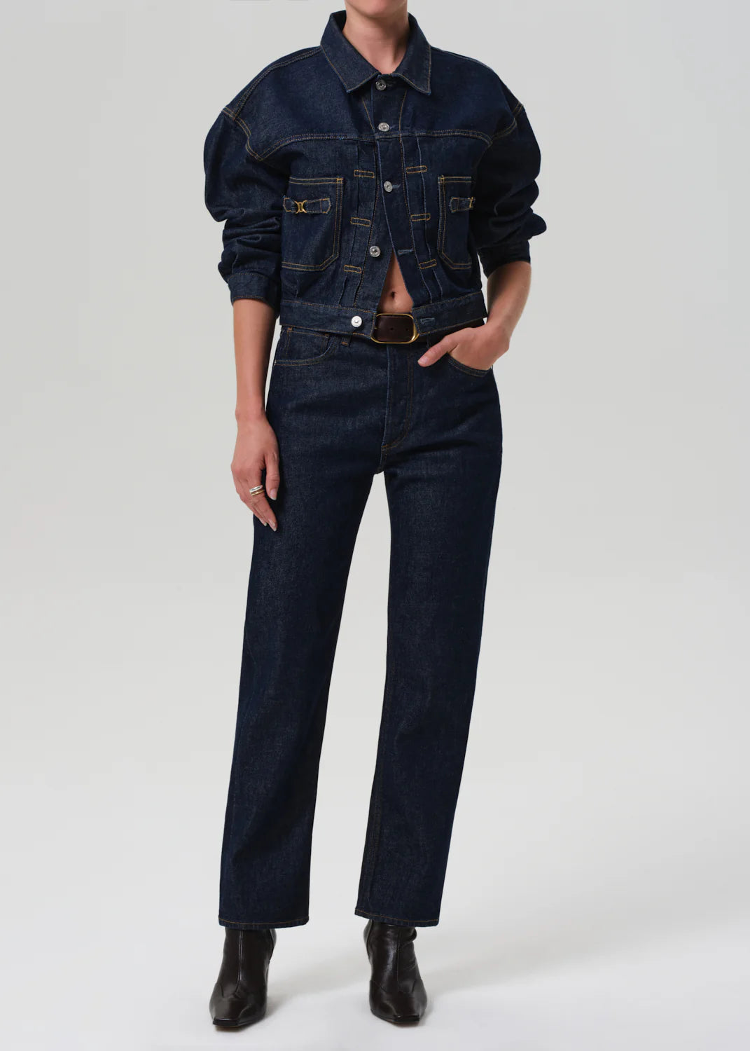 Looks Like: Clean dark rinsed out indigo denim jacket with horsebit detailing
