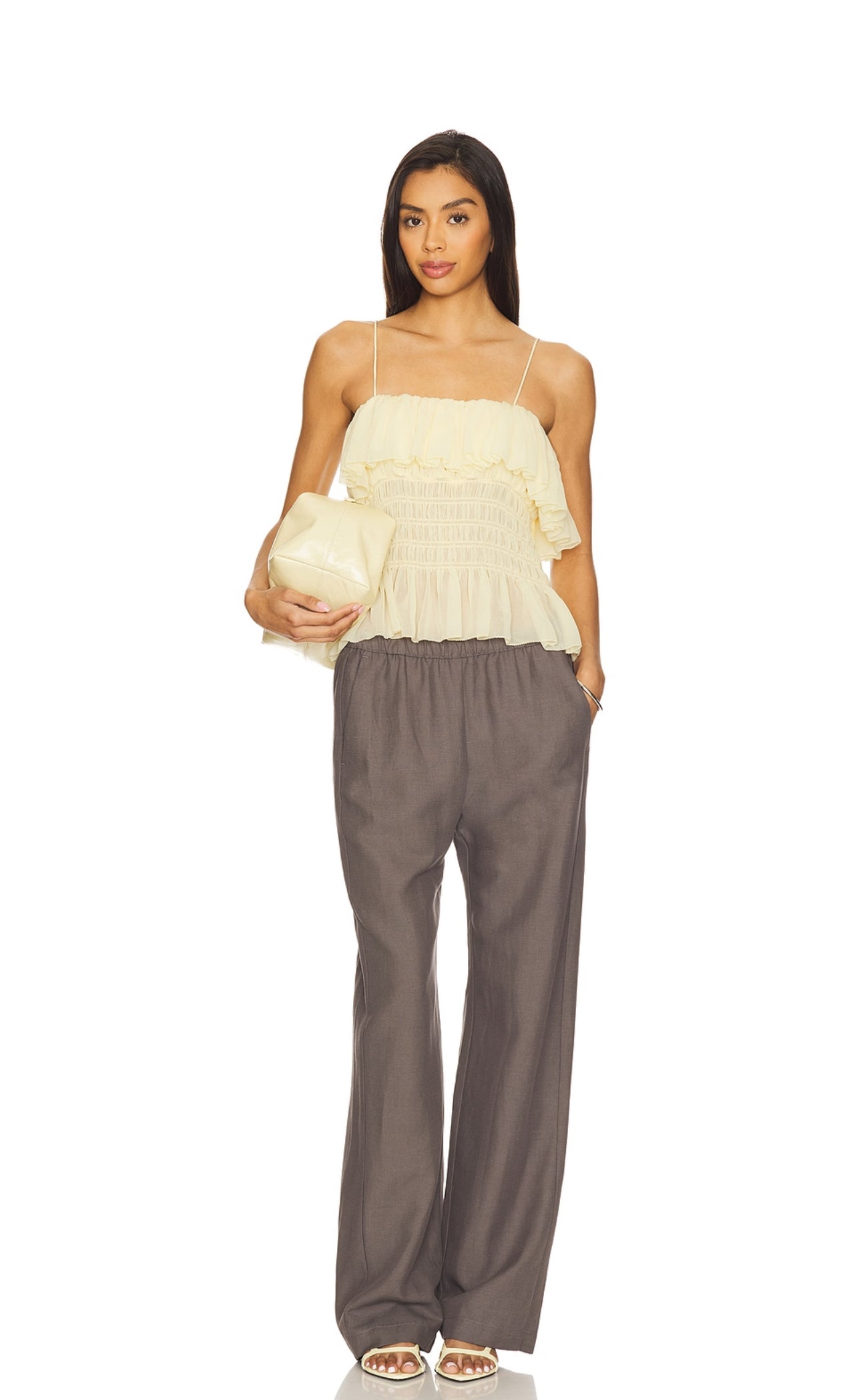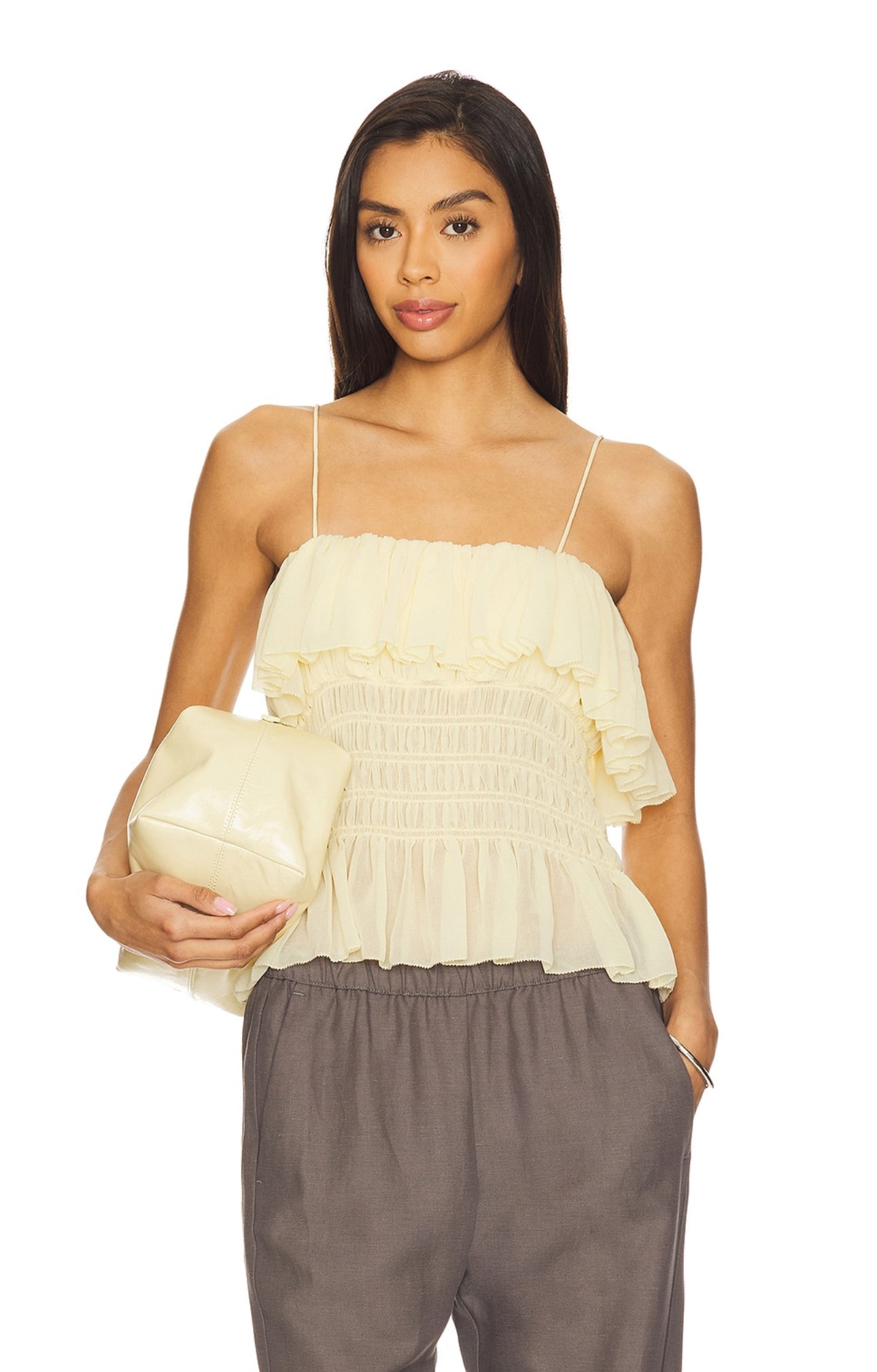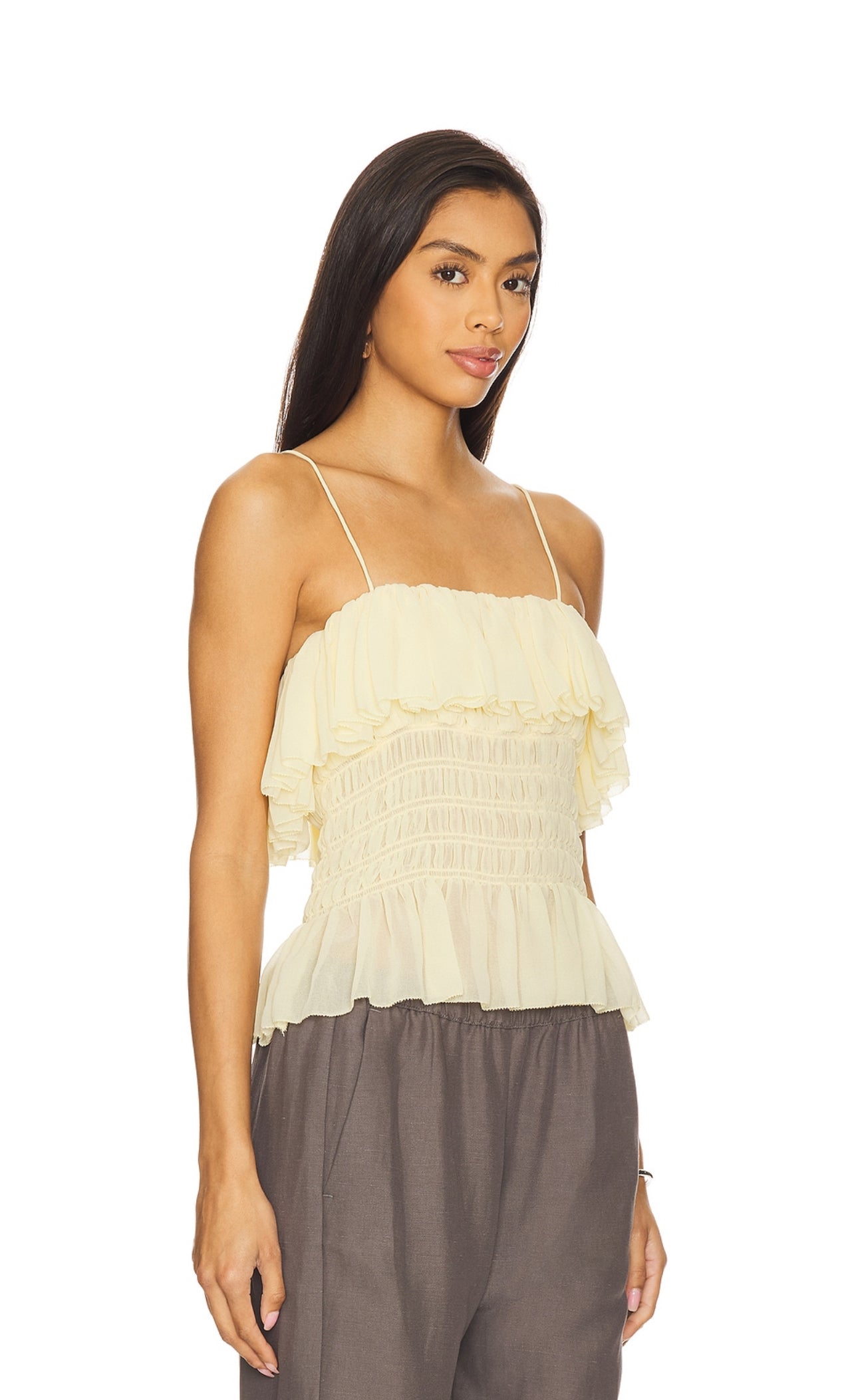 A soft pastel yellow hue enhances the refined silhouette of this top. Clean lines and a structured fit create an elegant yet understated look, perfect for effortless sophistication.
