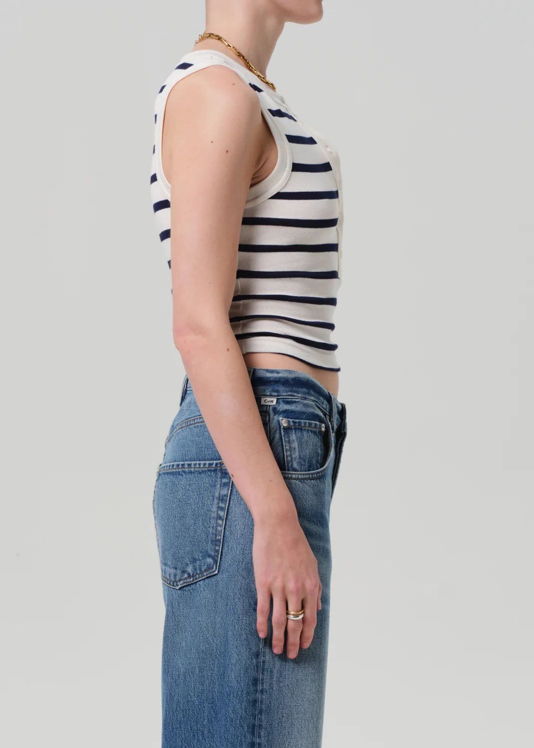 The Carolyn Tank is a button-front staple, crafted from signature rib fabric for a form-fitting silhouette. Perfect for layering with tonal pieces or wearing on its own, this versatile tank offers effortless style that works for any occasion. Pair it with high-waisted denim for a sleek, streamlined look or dress it up with a blazer for a more polished vibe.