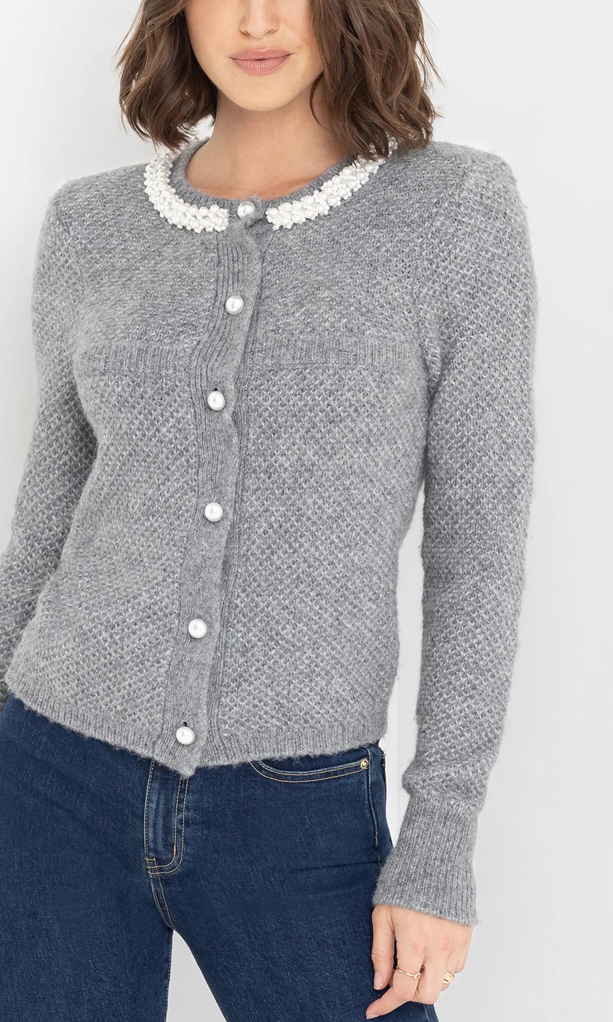 Lustrous pearl trim traces the neckline, imbuing this classic cardigan with refined elegance. A polished fall essential that complements both everyday staples and dressier separates.