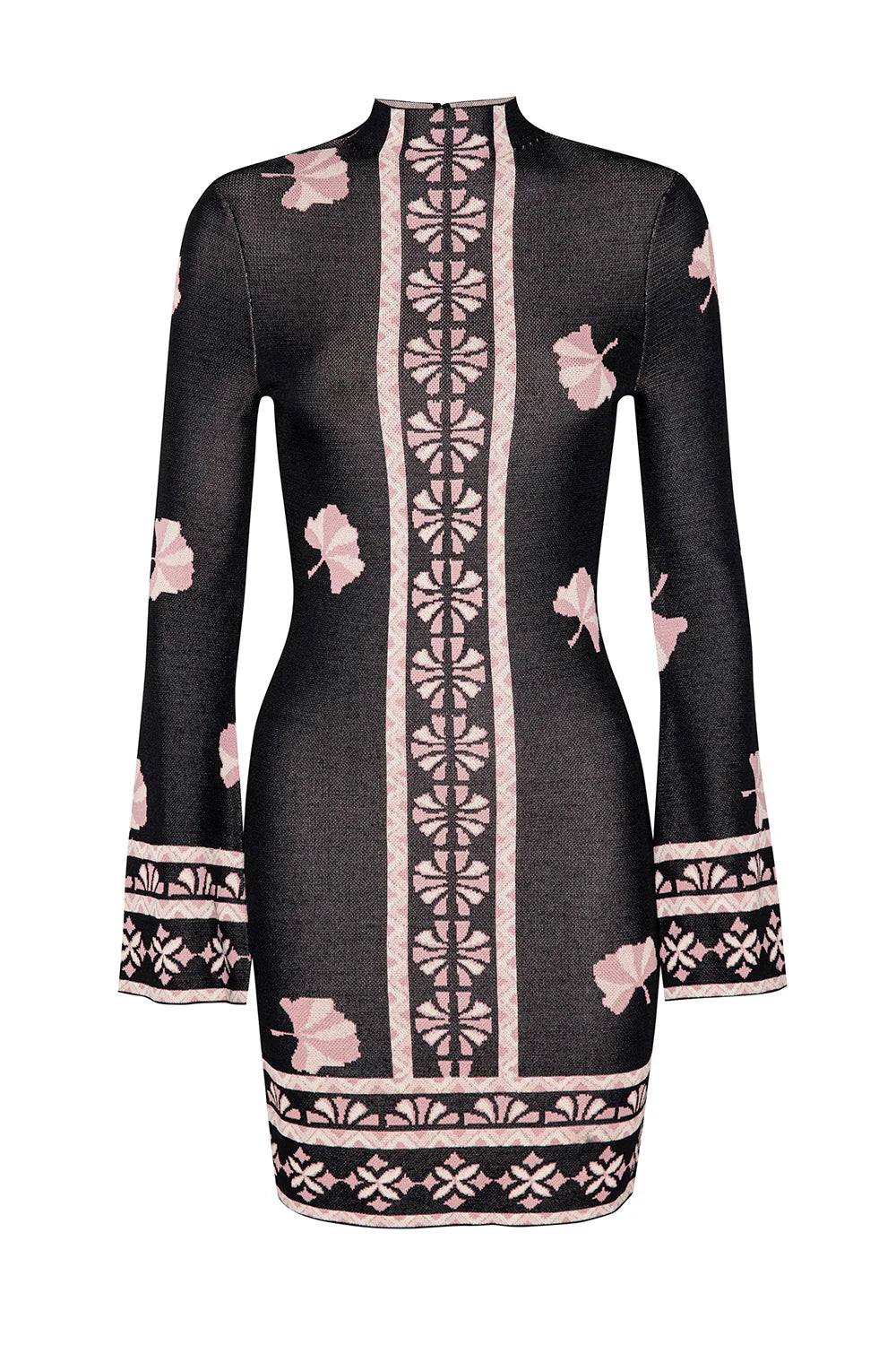 Deliz is a striking mini dress crafted from our pale-pink-on-black Ginko border motif knit jacquard. This figure-hugging silhouette features a mock turtleneck with a double button back closure and long sleeves finished with a subtle flare. Effortlessly versatile—pair it with knee-high boots for cool-weather chic or elevate it with strappy heels for an evening look.