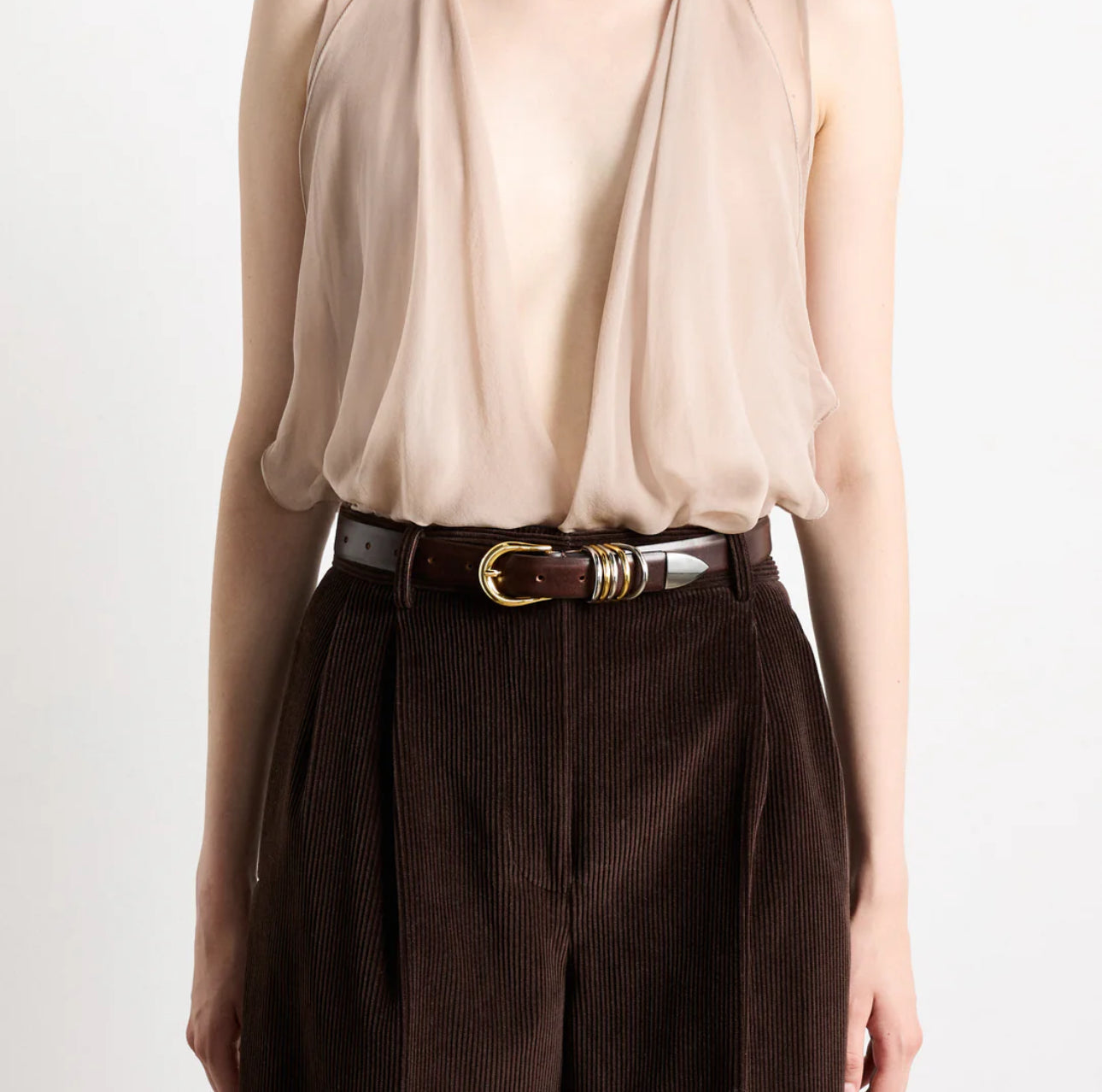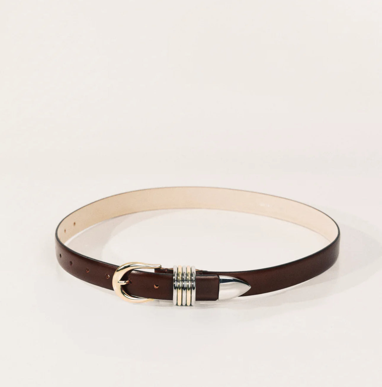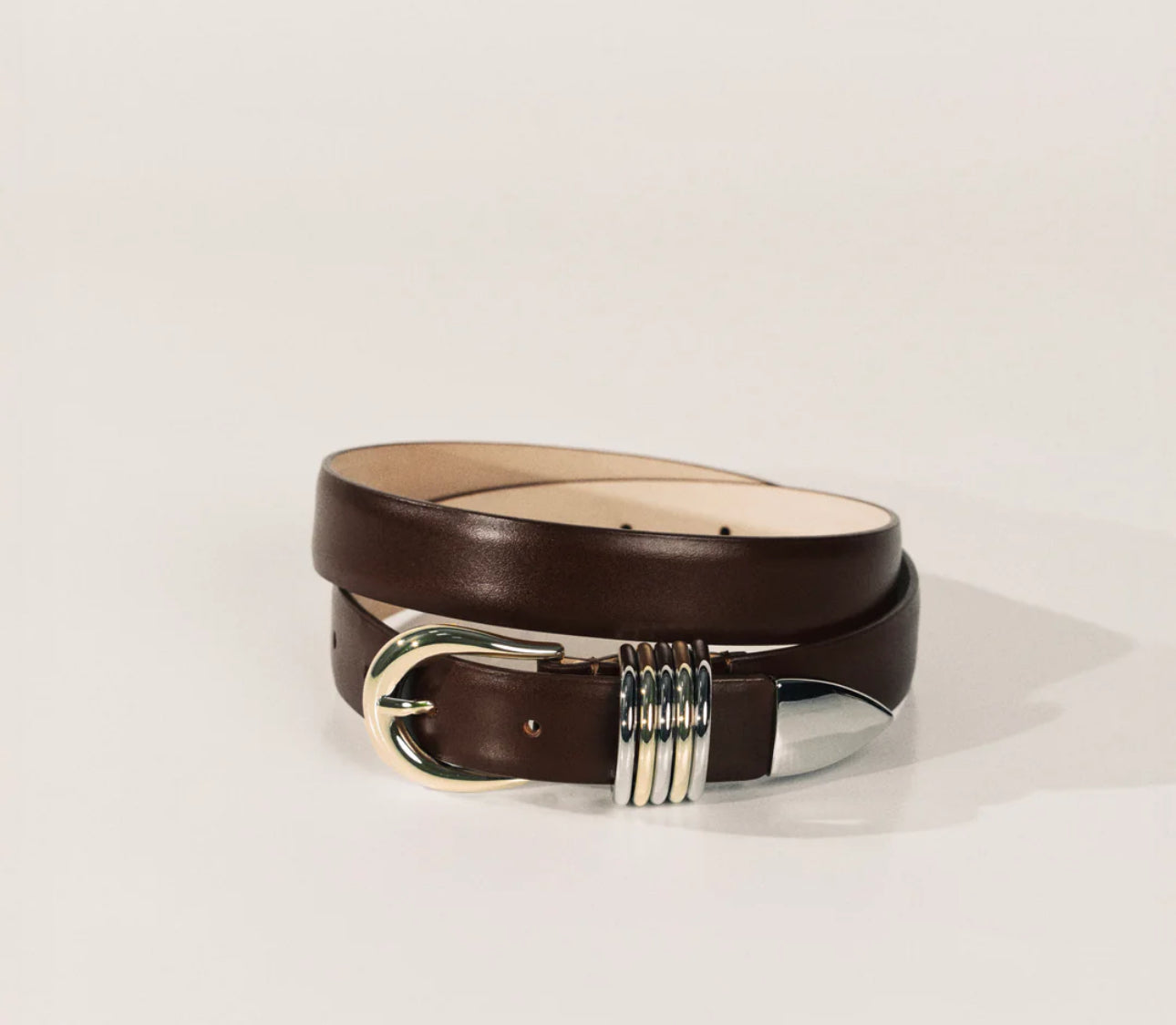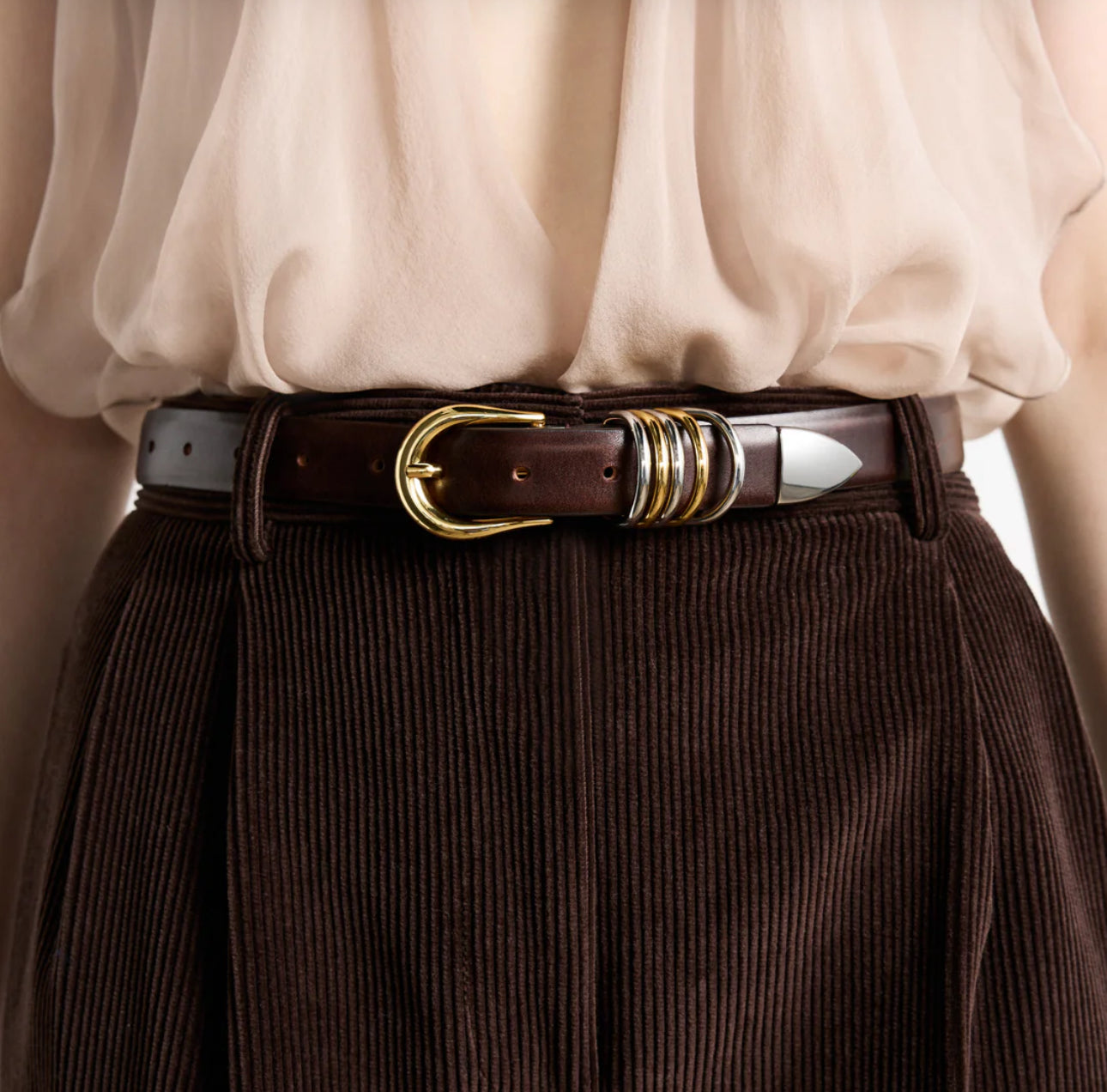 Déhanche's signature style featuring 5 rings adornments with 10 holes and an extended strap length to accommodate a broader range of sizes. Meticulously crafted from Italian leather and silver & 24K gold hardware.