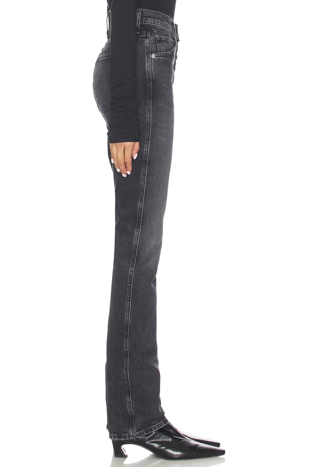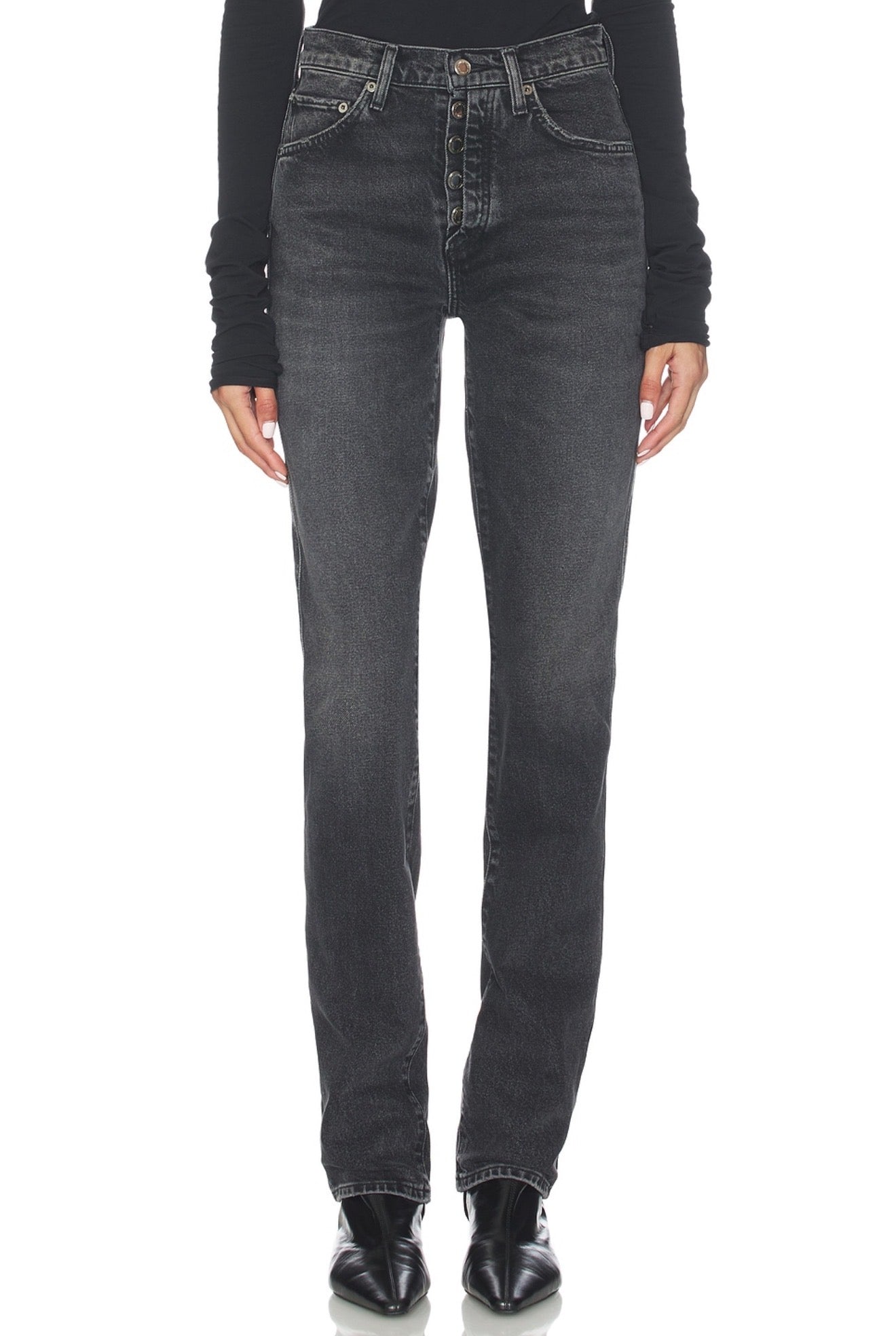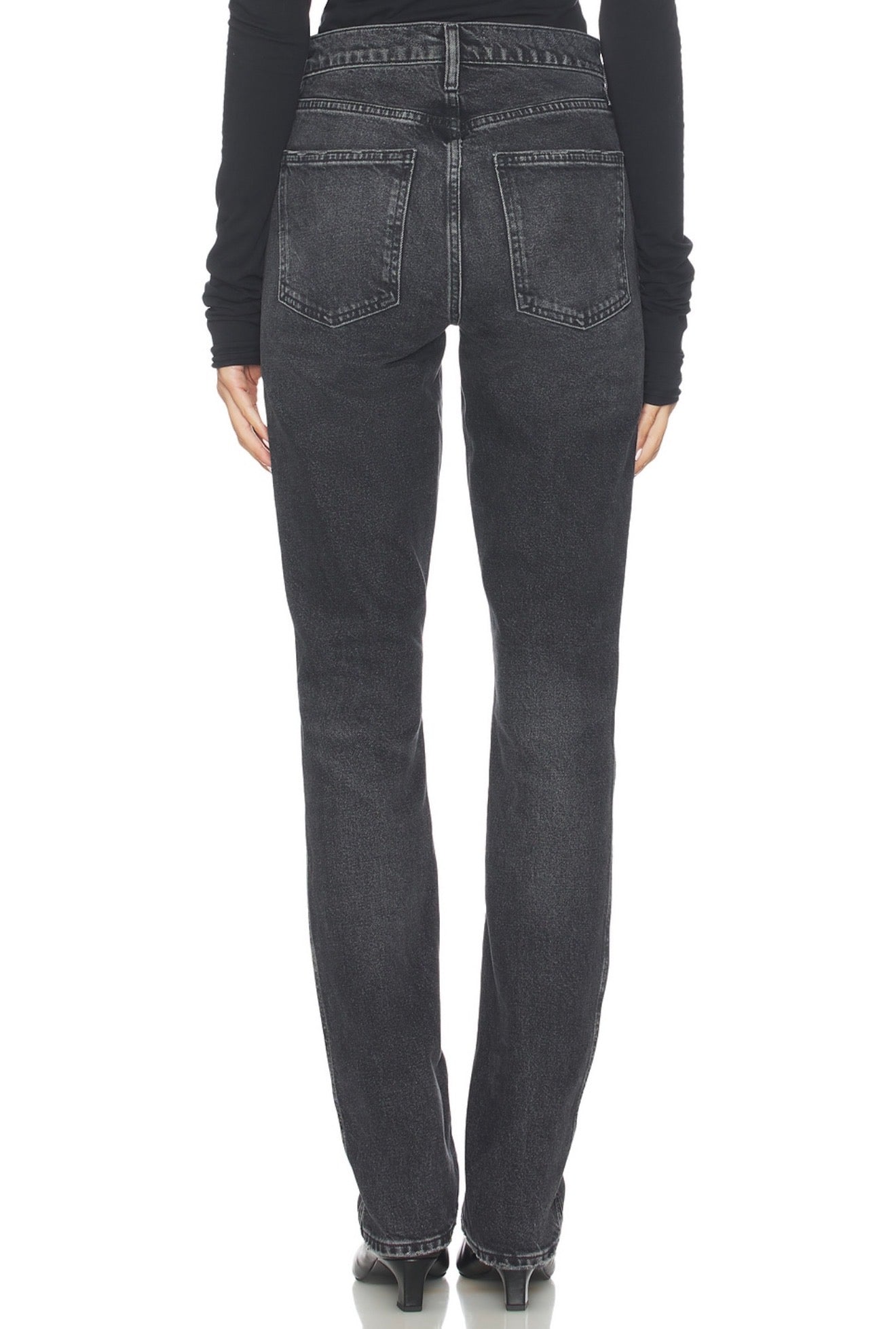 A high-rise skinny with a slim fit and exposed fly. Crafted from soft, comfort-stretch denim, it has a true-to-size fit and a clean, stacked silhouette. In dark vintage black, subtle fading and marbling add texture, making it a modern essential for effortless, elevated styling.