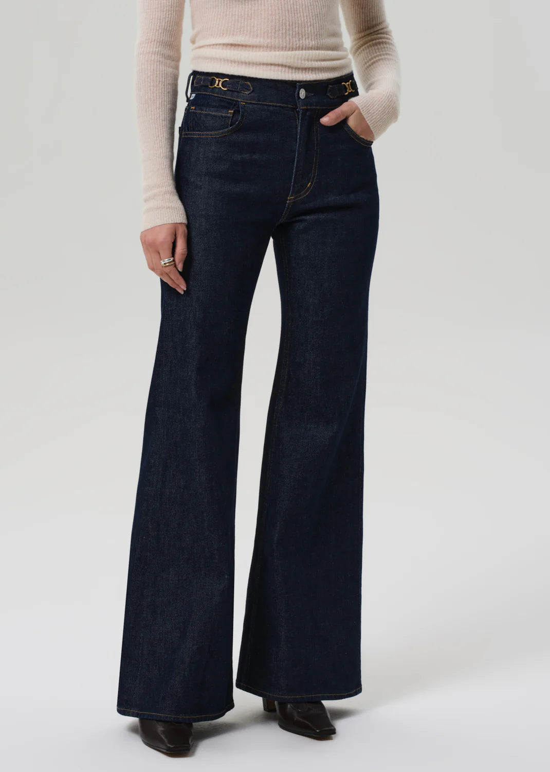The Kimberly is a high-rise flare inspired by classic '70s silhouettes, designed to elongate the leg and contour the waist. This version is finished with horsebit detailing at the waistband for a refined, equestrian-inspired touch. Crafted from comfort stretch denim with a super soft hand, the Helia wash—a clean, dark indigo rinse—adds a polished finish. Style with crisp shirting or a fitted knit for elevated ease.