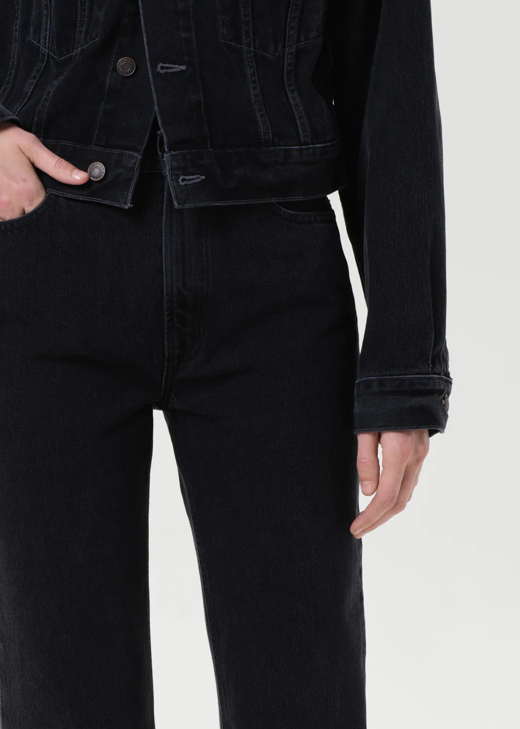 A flattering high-rise flare with an elongated leg, the Leena is cut from rigid, non-stretch denim crafted with organic and recycled fibers for a structured yet soft feel. This pair is finished in a washed-out black with warm undertones and subtle fading for a broken-in effect. Style with a crisp white tee or oversized blazer for a clean, tonal look.