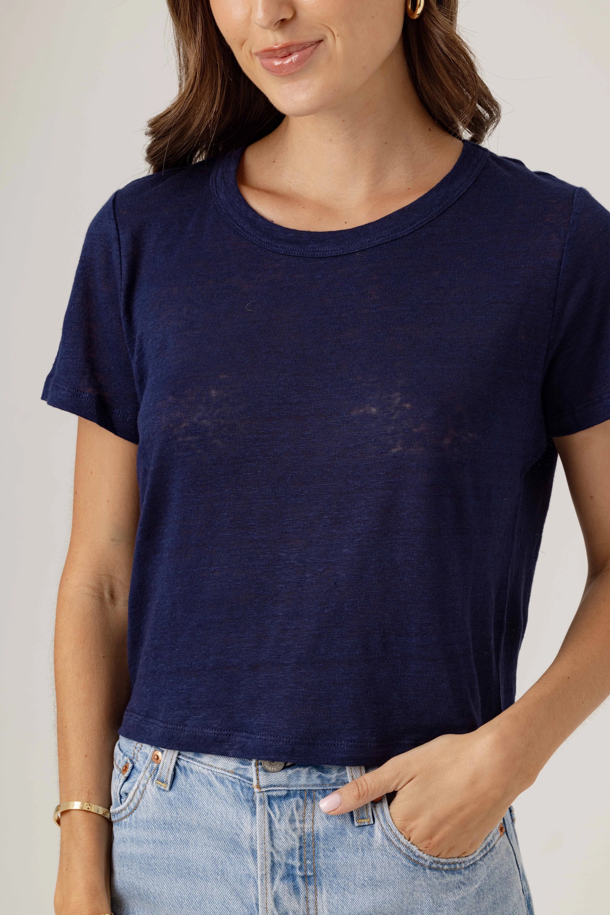 The latest edition to our Washed Linen Tee collection: Meet the Brother tee. Fit as if you stole your little brother's t-shirt, the Brother tee has a shrunken fit through the body with a short cap sleeve. Finishing right at your belly button, the Brother tee is perfect for styling with high-waisted bottoms. Made from a lux washed linen, it's the perfect effortless essential for any occasion.