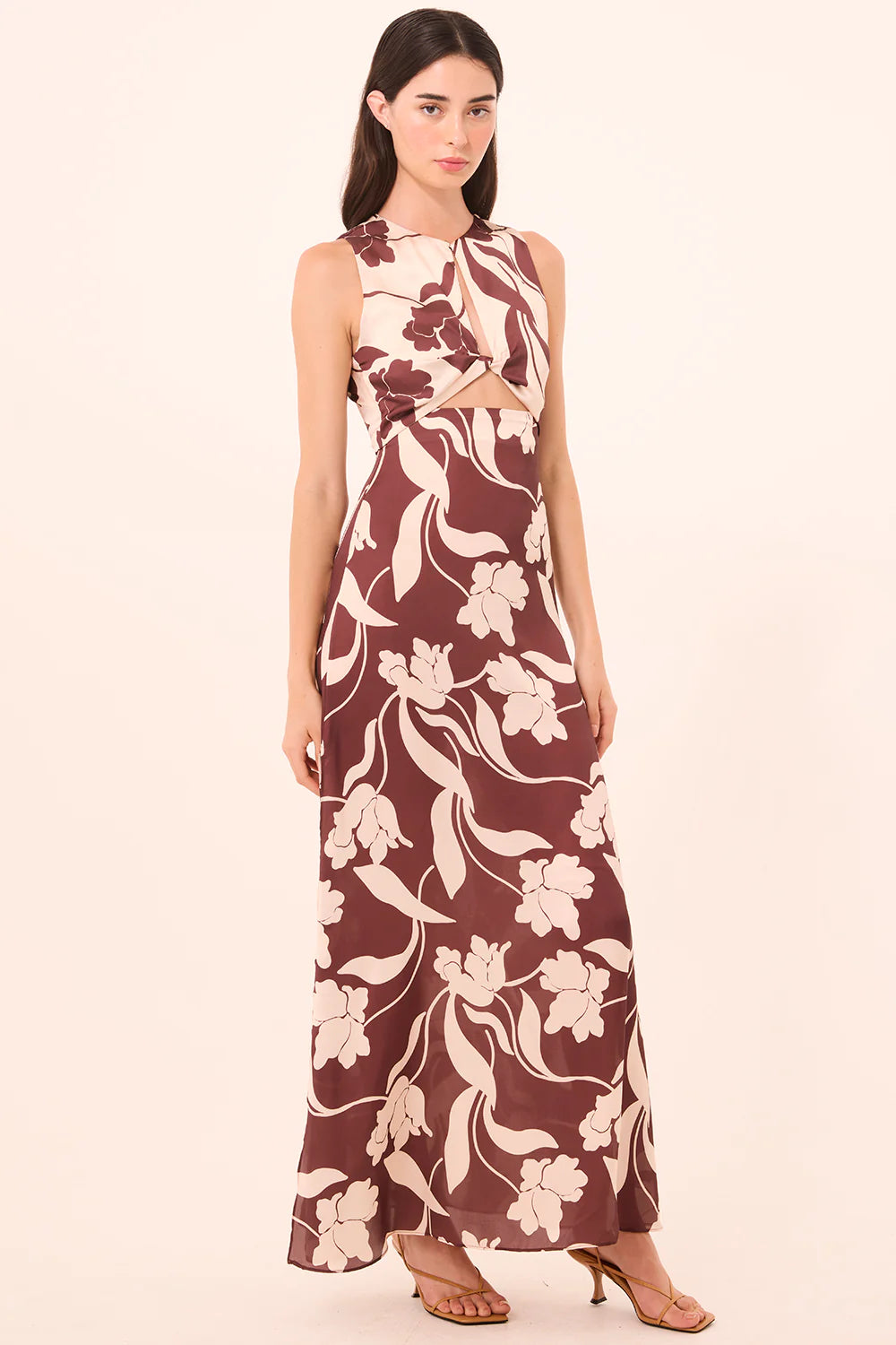 The Louanne dress is a stunning satin maxi in a Chocolate Flora print, designed to turn heads. Sleeveless with a high neckline, it features a twist keyhole detail and a triangle cutout just above the waist. Finished with a hidden side zip, Louanne is the perfect dress for your next warm-weather getaway.