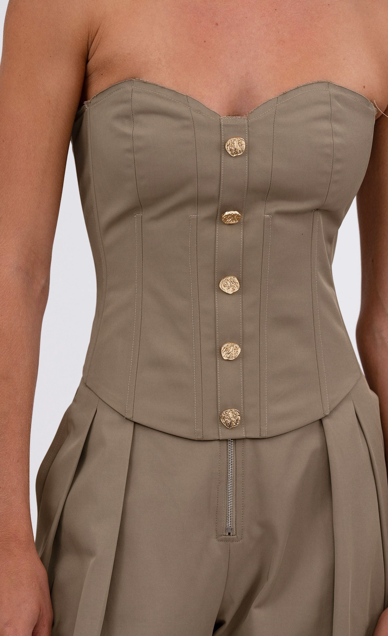The Maya Bustier is a structured, strapless top designed for a bold yet flattering look. Featuring a sweetheart neckline, zipper in the back and gold button detailing down the center, it’s made from structured cargo fabric in our seasonal moss color. Exuding effortless cool-girl style, it pairs perfectly with the matching Walker Pant for the ultimate look.