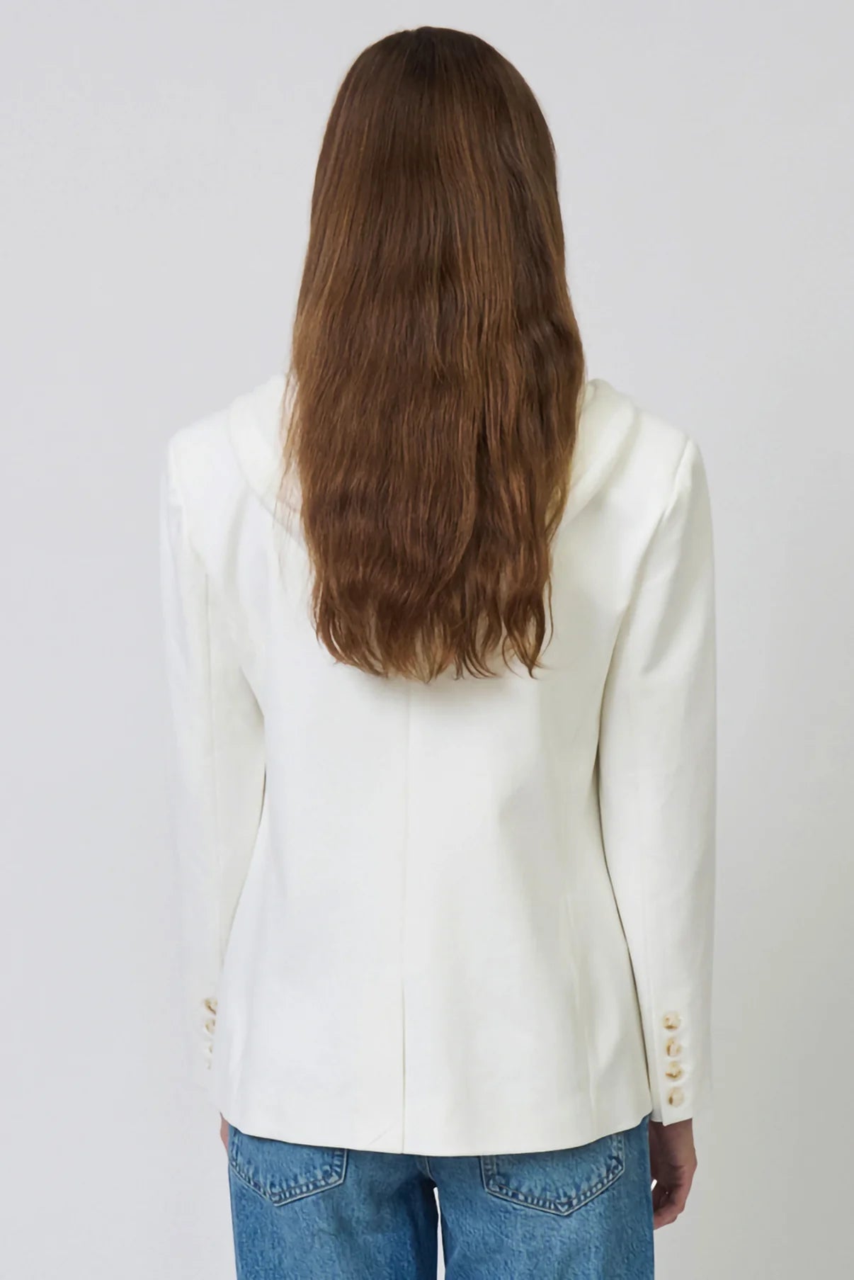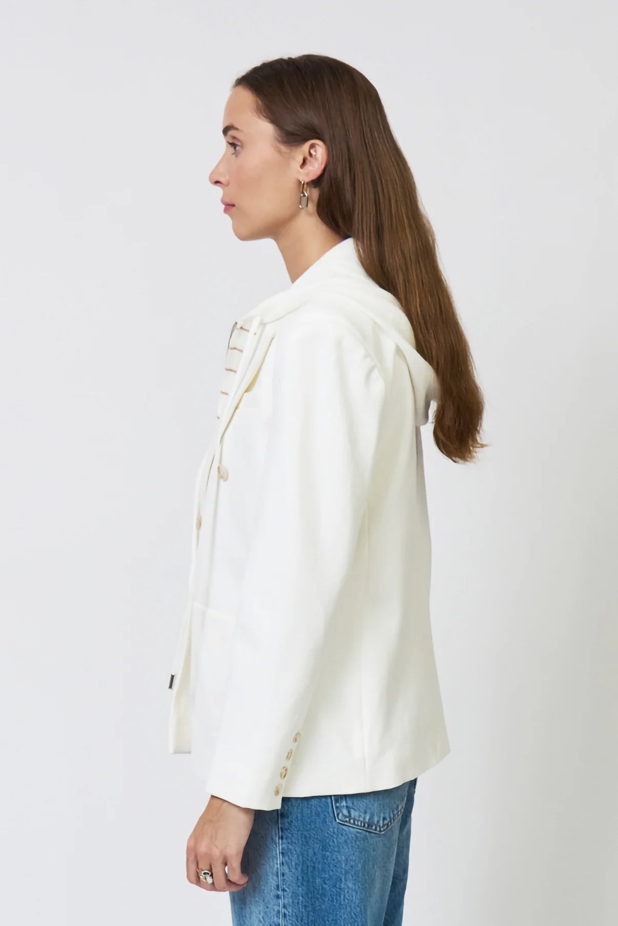 - This hybrid blazer-hoodie combines tailored notched lapels and double-breasted buttons with a drawstring hood and functional pockets, offering a polished yet comfortable layered look.