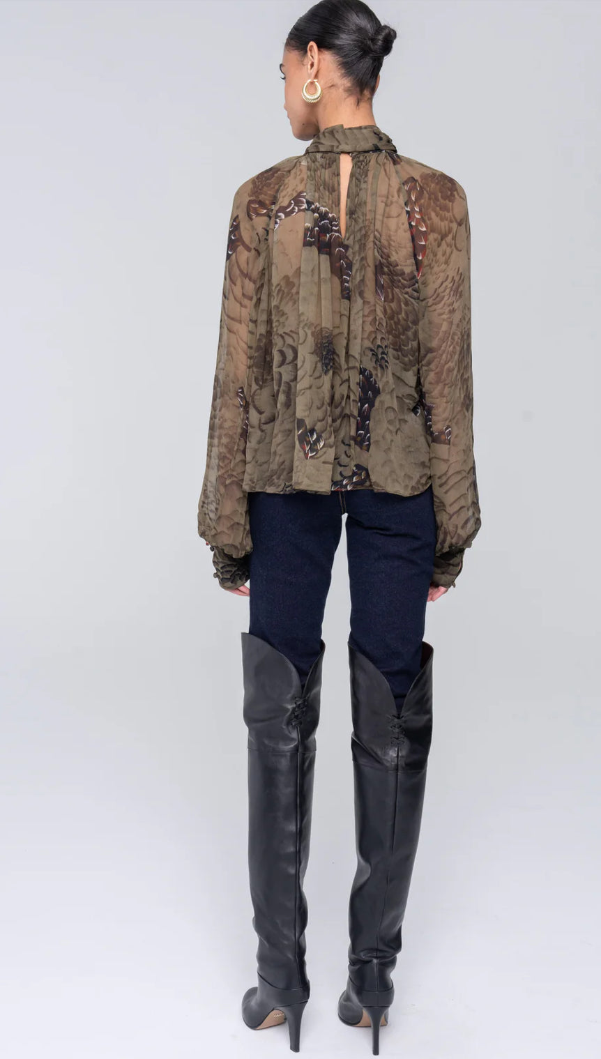 Airy and alluring. The Zenia Top is crafted from sheer chiffon in a jade camo print with soft ruffles, voluminous sleeves, and an elegant tie neck. Tuck it into high-rise denim or wear it loose for a romantic, undone look.
